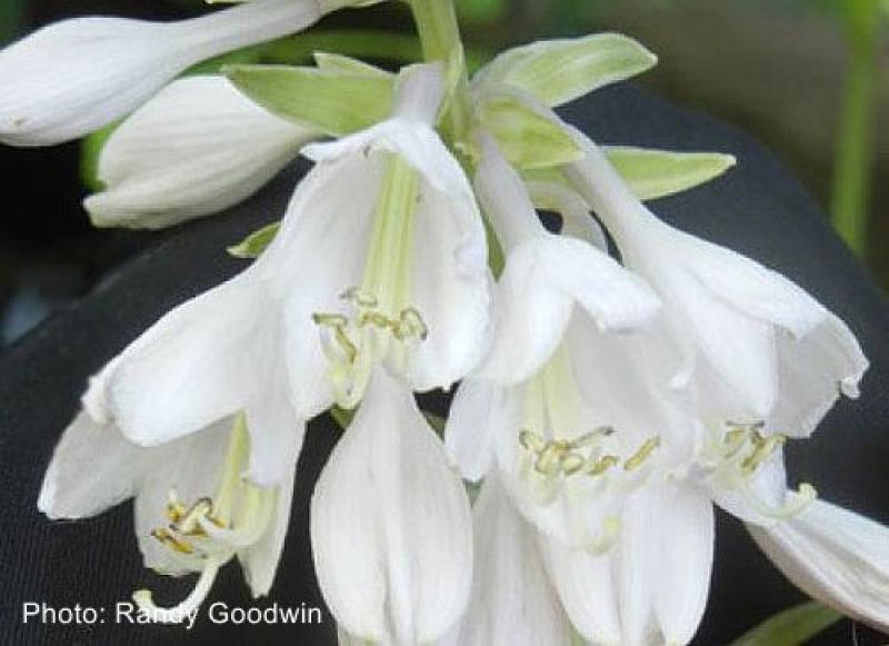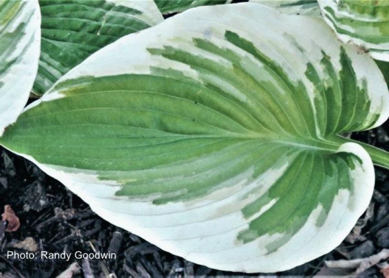 From Randy Goodwin comes this striking hosta, a seedling of H. montana. The pointed leaves are blue-green with yellow margins that cut into the centers. The margins turn to white in the summer as the centers turn more green. It grows around 15" tall and 30" wide. Near white flowers in early summer.