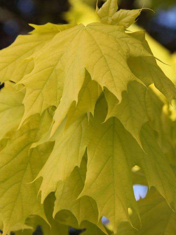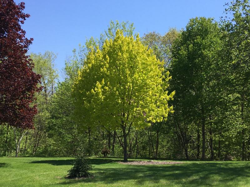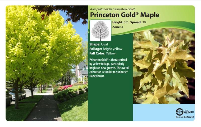 The yellow foliage of Princeton GoldĀ® is especially bright in on new growth in the spring, but remains a bold yellow color all season. The overall coloration is similar to SunburstĀ® Honeylocust. Rounded to oval in shape, growing 35' tall with spread of 30'. Hardy to Zone 4. We have two of them planted at the Gardens, and they are always eye-catching.