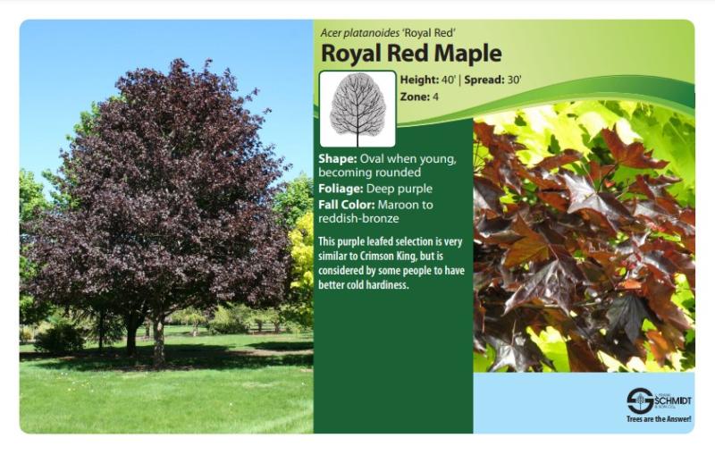 The 'Royal Red' Maple boasts deep purple leaves similar to Crimson King, but is considered to have better cold hardiness. Look for maroon to reddish-bronze fall color. This maple has an overall oval shape when young, becoming rounded as it ages. Mature Height 40'. Mature Spread 30'. Hardy to Zone 4.