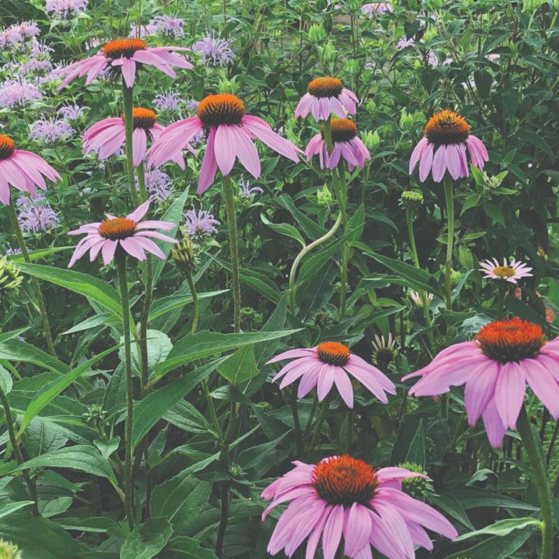 Echinacea purpurea is a native perennial with tall purple coneflowers. It is drought tolerant and grows 2-4' tall. Great for prairie plantings. Grow in full to mostly sun. Will reseed freely if some seed heads are left in place. Hardy to Zone 3.