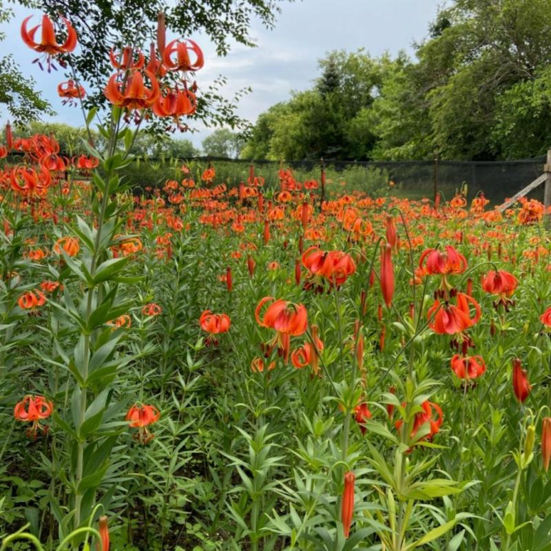 Michigan Lilies produce large, bright orange flowers with dark spots and strongly recurved petals which dance along tall stems, 4-6' tall. flowers appear in June-July. Bulbs will multiply underground. Attracts butterflies, hummingbirds, and other pollinators. Likes somewhat moist but well drained conditions. Hardy to Zone 4.
