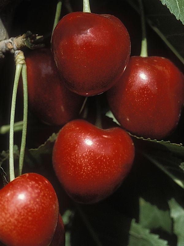 'Stella' is a popular sweet cherry cultivar that produces dark red, sweet eating cherries in early summer. It is self-fertile, and commonly sold as semi-dwarf to dwarf grafted trees. Fragrant, white blossoms appear in spring, and dark green leaves turn yellow in the fall. Grows 8 to 12 feet tall in full sun. Hardy to Zone 5.