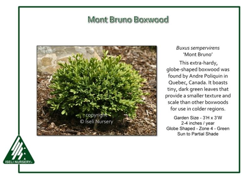 Buxus sempervirens ‘Mont Bruno’ is an extra-hardy, globe-shaped form that was found by Andre Poliquin in Quebec, Canada. Its tiny, dark green leaves provide a smaller texture and scale than other selections of boxwood and its hardy nature makes it useful in colder regions. Grows 2-4 inches per year to reach a mature size of 3' tall and wide. Full sun to part shade, hardy to Zone 4