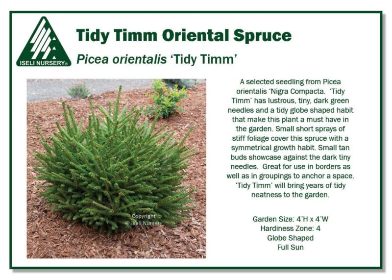 A selected seedling from Picea orientalis ‘Nigra Compacta. ‘Tidy Timm’ has lustrous, tiny, dark green needles and a tidy globe shaped habit that make this plant a must have in the garden. Small short sprays of stiff foliage cover this spruce with a symmetrical growth habit. Small tan buds showcase against the dark tiny needles. Great for use in borders as well as in groupings to anchor a space. ‘Tidy Timm’ will bring years of tidy neatness to the garden. Full sun. Garden size is 4' tall and wide. Hardy to Zone 4.