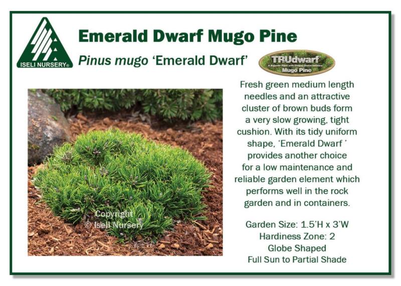 Emerald Dwarf Mugo Pine has fresh green medium length needles and an attractive cluster of brown buds forming a very slow growing, tight cushion. With its tidy uniform shape, ‘Emerald Dwarf ’ provides another choice for a low maintenance and reliable garden element which performs well in the rock garden or wherever you need a dwarf evergreen. Grow in full sun to part shade. Garden size is 1.5' tall and 3' wide. Hardy to Zone 2.