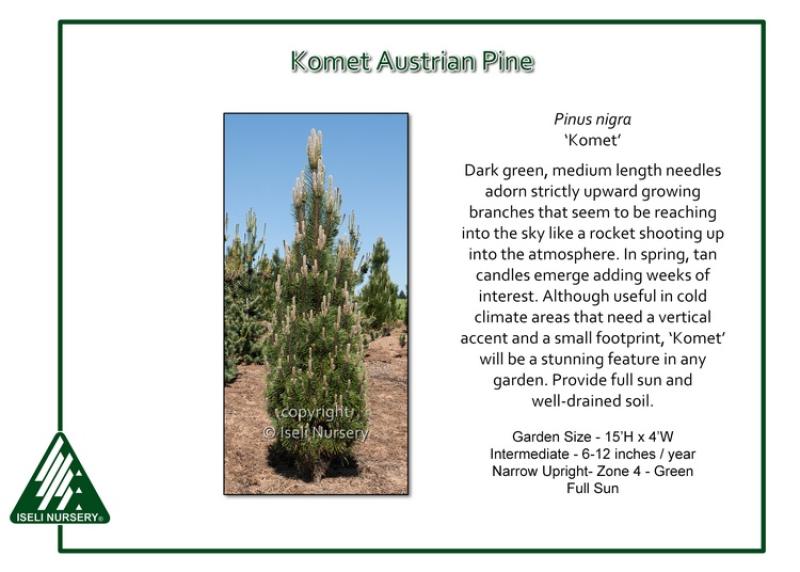 Dark green, medium length needles adorn strictly upward growing branches that seem to be reaching into the sky like a rocket shooting up into the atmosphere. In spring, tan candles emerge adding weeks of interest. Although useful in cold climate areas that need a vertical accent and a small footprint, Pinus nigra ‘Komet’ will be a stunning feature in any garden. Provide full sun and well-drained soil. Garden size is 15' tall and 4' wide. Hardy to Zone 4.