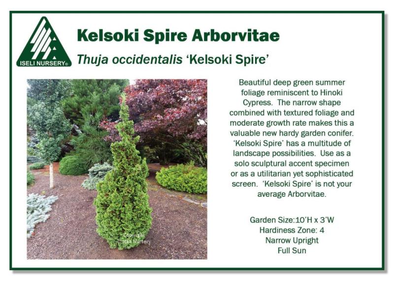 Beautiful deep green summer foliage reminiscent to Hinoki Cypress. The narrow shape combined with textured foliage and moderate growth rate makes this a valuable new hardy garden conifer. ‘Kelsoki Spire’ has a multitude of landscape possibilities. Use as a solo sculptural accent specimen or as a utilitarian yet sophisticated screen. ‘Kelsoki Spire’ is not your average Arborvitae. Grow in sun. Garden size is 10'h x 3'w. Hardy to Zone 4.