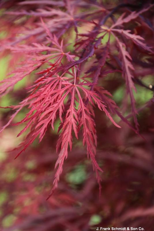 (Japanese Laceleaf Maple) the new nursery standard for red laceleaf Japanese maples; dark purple-maroon foliage color throughout the hot summer months on a vigorous, well-branched tree. Turns bright red in fall. Grows 7-8' tall and 5' wide. Hardy to Zone 5.