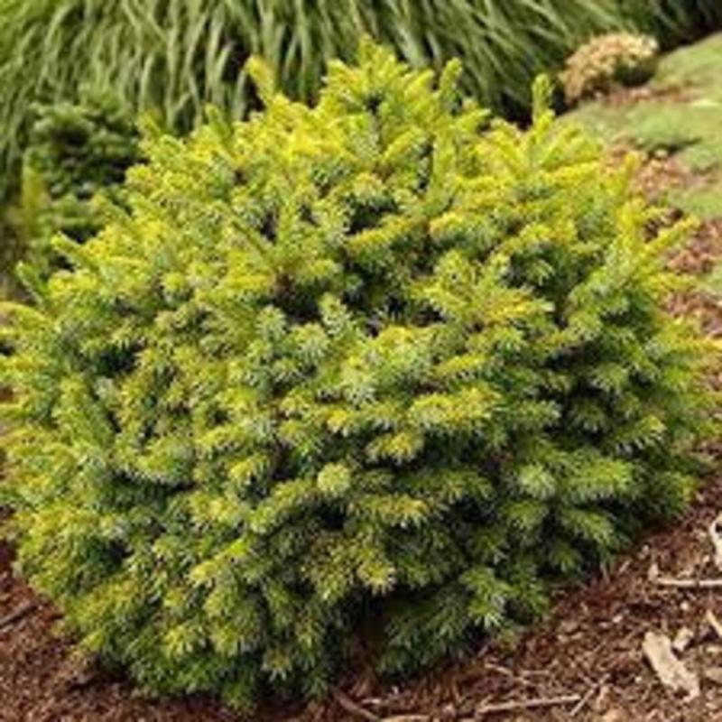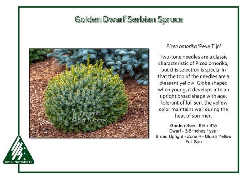 Two-tone needles are a classic characteristic of Serbian Spuce, but Picea omorika ‘Peve Tijn’ is special in that the top of the needles are a pleasant yellow. The yellow combines with the silvery undersides to create a frosted appearance. Globe shaped when young, it develops into an upright broad shape with age. Tolerant of full sun, the yellow color maintains well during the heat of summer. Garden size is 6' tall and 4' wide. Hardy to Zone 4.