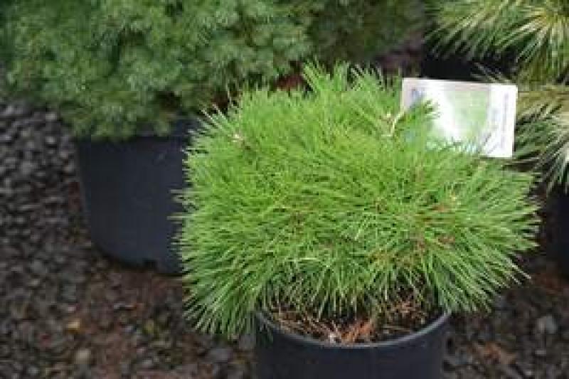 'Jane Kluis' is a flat-topped, dwarf, globose pine with very straight, rigid green needles. New growth is prolific and contrasts nicely with creamy white buds. Ten year size is listed at 3' tall and 5' wide. It's a good grower, so will be larger than that as it matures. Hardy to Zone 5.