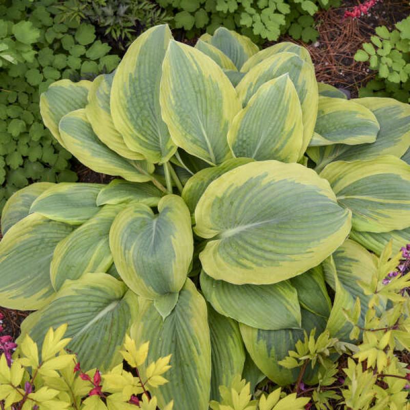 Take a chance on this exciting new Hosta! Heart-shaped powdery blue leaves have a wide gold margin. Leaves emerge with an apple-green margin that turns gold as leaves mature. 'Chance Encounter' takes its name from the rare watermark halo that appears where the center and marginal variegation meet. 'Chance Encounter' is modestly sized as 12-16" tall, but incredibly broad reaching over 3' across. Use this selection as a specimen along the front of the shade border. White flowers appear in early summer.