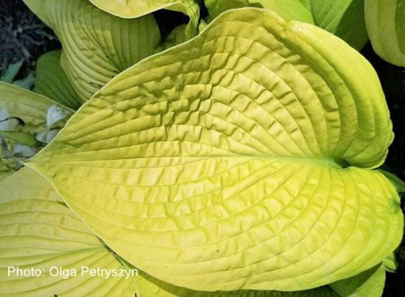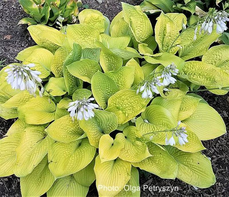 Another great large hosta from Olga Petryszyn. Golden yellow leaves are tightly packed, yet neatly arranged, forming an impressive clump. Good substance and corrugation. Grows around 26" tall and 43" wide. Near white flowers in summer.