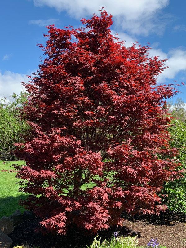 Acer palmatum ‘Twombly’s Red Sentinel’ is a vigorous, upright, red tree that develops an unusually columnar habit allowing it to fit into a smaller space than forms with broad canopies. Leaves maintain their dramatic red color all season long, and after they drop, the branches continue the colorful display. They darken to a deep, warm red that stands out against the grays and whites of winter. Garden size is 20' tall and 15' wide. It can handle a lot of sun, but as with most Japanese maples, it is best grown in some afternoon shade. Hardy to Zone 5