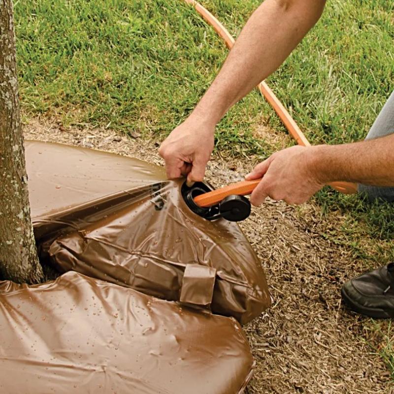 A water bag will allow you to provide a substantial amount of water quickly to your tree without waiting for the water to soak in and without guessing as to how much water you have provided. Just fill the bag with water from a hose, and the water will then slowly trickle into the planting hole. The roots will be encouraged to follow the water down into the ground.