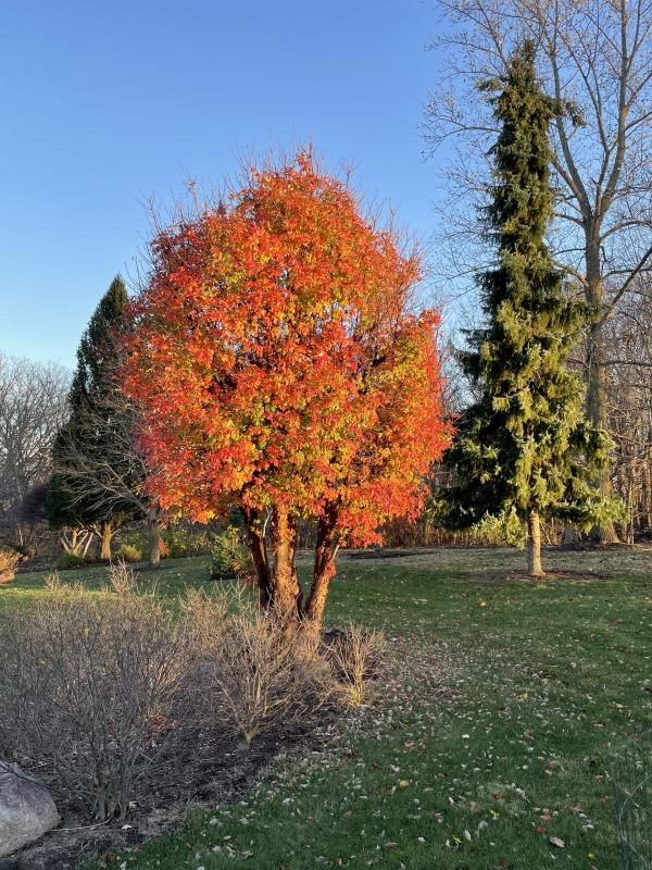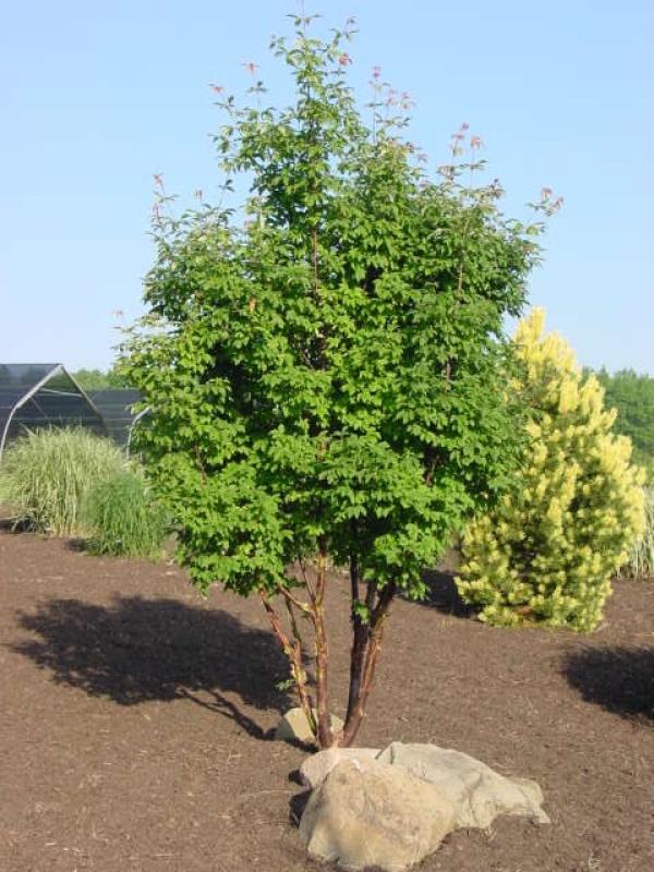Paperbark Maple is a highly ornamental small tree prized for its exceptional year-round interest, especially its striking, cinnamon-colored exfoliating bark that peels in thin curls to reveal warm tones beneath. This bark feature provides outstanding winter appeal unmatched by most small trees. Fine-textured, trifoliate dark green leaves create a soft summer canopy before turning vivid shades of red and orange in fall. Spring flowers are subtle but support early pollinating insects. Best grown in sun to part shade with moist, well-drained soils, Paperbark Maple is ideal as a specimen tree, near walkways, or in intimate garden settings where its bark can be appreciated up close.