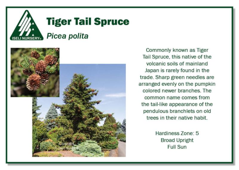 Hardy and adaptable, Picea polita thrives in full sun and well-drained soils, tolerating cold climates with ease. Its architectural structure and distinctive texture add visual interest in every season, making it a must-have for conifer enthusiasts and collectors alike. Whether used as a focal point or part of a diverse evergreen display, the Tiger Tail Spruce brings an elegant yet rugged charm to any landscape. Grows 40' tall and 25' wide in full sun and is hardy to Zone 5.