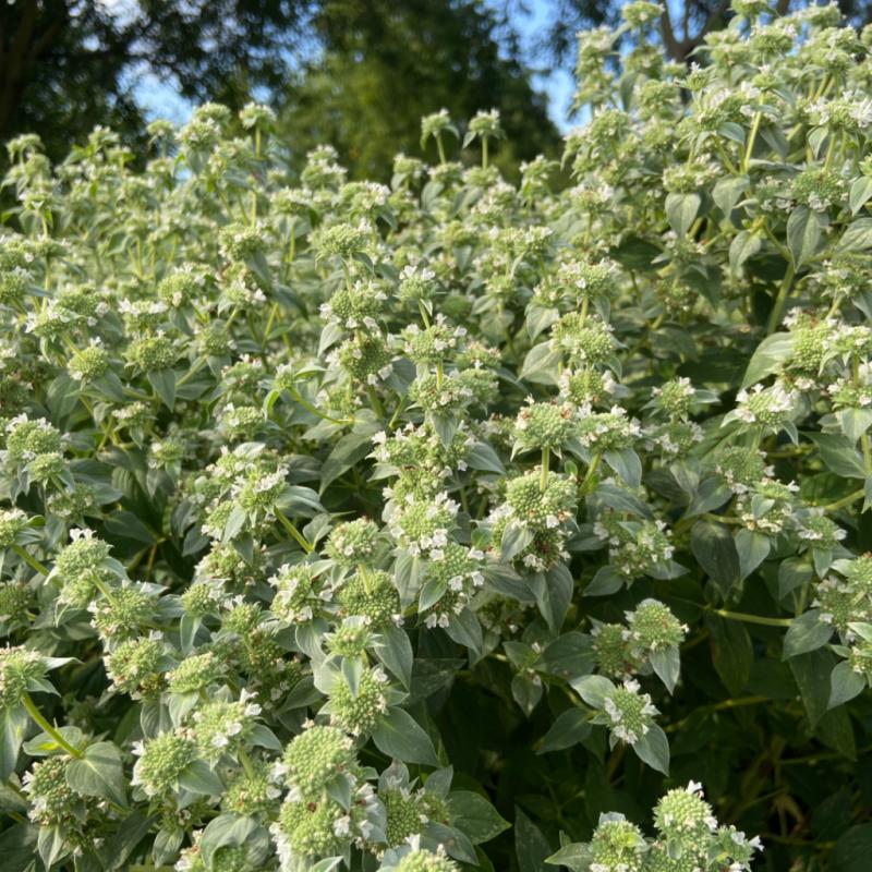 Pycnanthemum muticum, commonly known as clustered mountain mint, is a clump-forming aromatic perennial that is native to the eastern half of North America. This densely leaved mountain mint features dark green leaves which have a strong spearmint aroma when crushed. It is a vigorous grower that may spread by rhizomes in optimum conditions, but it is not invasive as are many of the true mints (Mentha). Small, pinkish white flowers form in late summer to early fall. Pollinators, like butterflies and bees, love this plant. Grows best in full to part sun and reaches a height of 1-3 feet tall. Hardy to Zone 4.