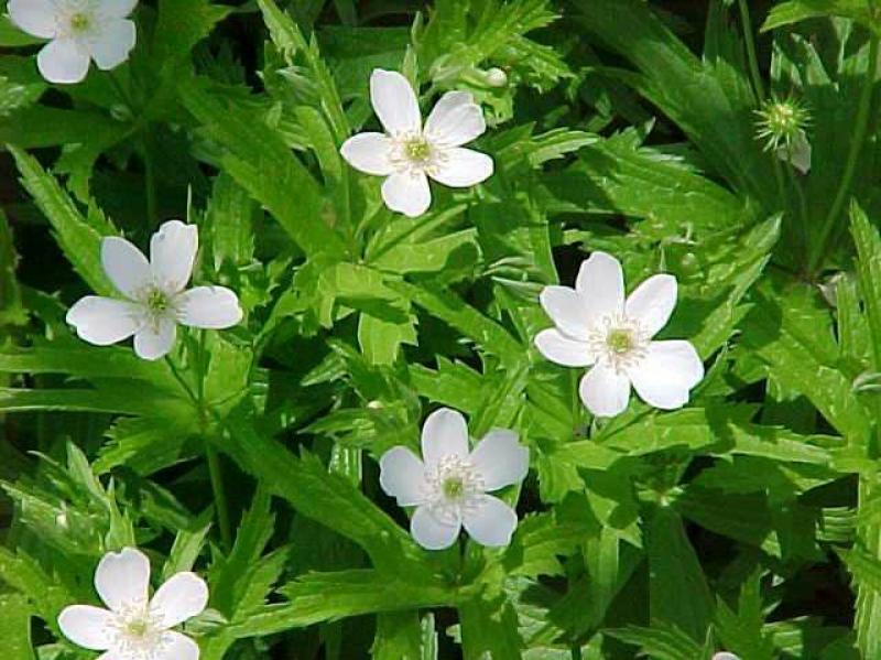 Anemone canadensis, commonly known as Canada anemone, is an herbaceous perennial of the buttercup family that produces an often spectacular bloom of apetalous, upward-facing, white flowers (to 2” diameter) which bloom in spring (April-June) atop erect hairy flowering stems (to 2’ tall) clad with broad, stalkless, deeply cut and sharply-toothed orbiculate leaves. Each flower features five showy petal-like white sepals and numerous contrasting yellow center stamens. Flower stems rise from a basal clump of deeply-dissected, long-stalked, 3-5 lobed basal leaves. Anemone canadensis is a Rhizomatous plant naturalizes easily and is easily grown in average, medium to wet, well-drained soils in full sun to part shade. Prefers moist, humousy soils in part shade, but tolerates full sun in cool summer climates. Flowering stems tend to flop in too much shade. Rhizomatous plant that can naturalize in the landscape. May be grown by streams, ponds, or water gardens.