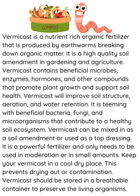Vermicomposting produces Vermicast, a nutrient-rich organic fertilizer that is produced by earthworms breaking down organic matter. It is a high quality soil ammendment in gardening and agriculture. Vermicast contains beneficial microbes, enzymes, hormones, and other compounds that promote plant growth and support soil health. Vermicast will improve soil structure, aeration, and water retention. It is teeming with beneficial bacteria, fungi, and microorganisms that contribute to a healthy soil ecosystem. Vermicast can be mixed in as a soil ammendment or used as a top dressing. It is a powerful fertilizer and only needs to be used in moderation or in small amounts. Keep your vermicast in a cool dry place. This prevents drying out or contamination. Vermicast should be stored in a breathable container to preserve the living organisms.