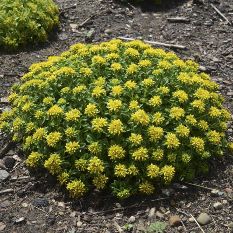 (Stonecrop) tiny clusters of yellow flowers on a compact, tidy clump of dark green, glossy foliage; 6-8 inches; full sun; Zone 3