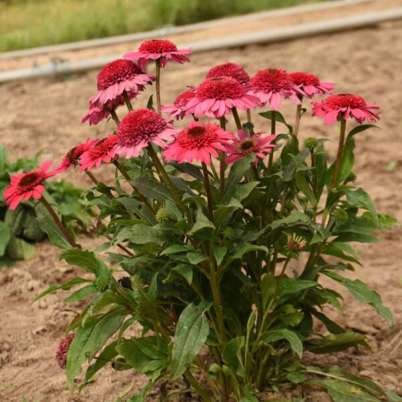 Echinacea ‘Coral Cranberry’ is a charming cone‑flower cultivar that features bright coral‑pink, fully double flowers carried on a low, wide, well‑branched plant. It typically reaches about 18–20" tall with a spread of 16–20". Its blooms sit over a mound of deep green foliage, and because of its compact, tidy habit, it works beautifully in front-of-border plantings, containers, or mixed perennial beds. Once established it shows heat and drought tolerance and adapts to average, well‑drained soil in full sun to part sun. Be sure to leave some spent blooms on the plants in the fall to provide winter food for finches and other birds.