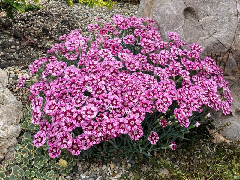 Dianthus Everbloomâ„¢ Raspberry Jam forms a compact mound of gray-green foliage topped with rich raspberry-red flowers with a deeper red eye from late spring through summer, often reblooming with deadheading. It thrives in full sun with well-drained soil, is drought tolerant once established, deer resistant, and attracts bees and butterflies.