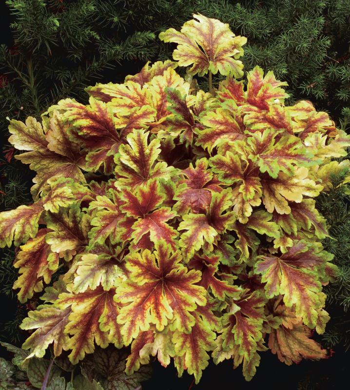 Heucherella ‘Gold Zebra’ features bright golden-yellow foliage boldly marked with wide, dark-red veins, creating dramatic, long-lasting color through the growing season. Airy white flowers appear in late spring to early summer, adding delicate highlights above the vibrant leaves. It thrives in partial shade with well-drained soil, is low maintenance, heat tolerant, and drought tolerant once established, and attracts pollinators like hummingbirds and butterflies.