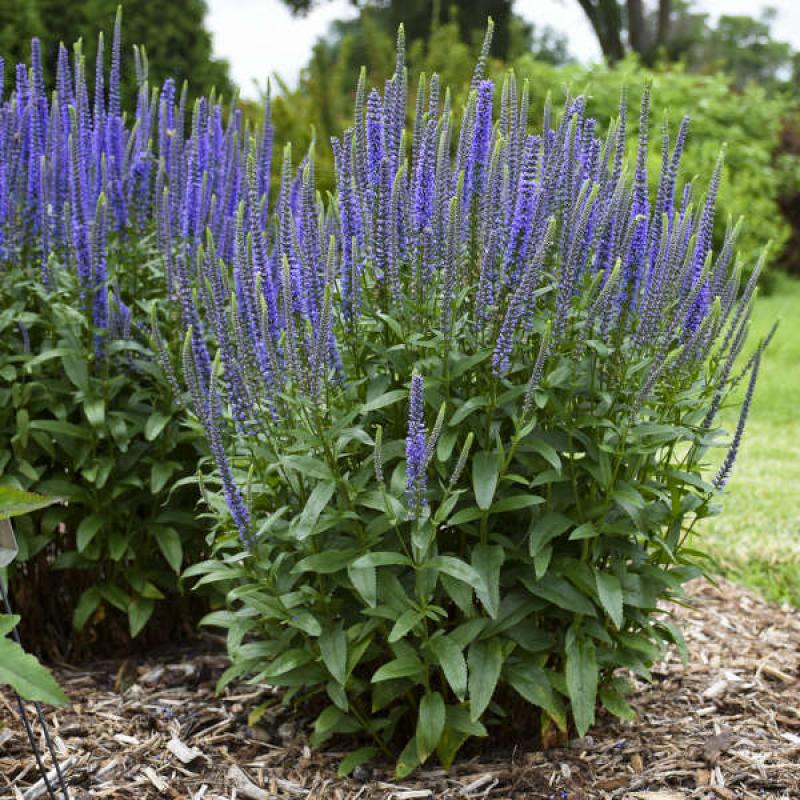 Veronica ‘Blue Skywalker’ is a tall, upright perennial whose lavender‑blue flower spikes rise above a dense mound of medium green lance-shaped leaves, creating a striking vertical accent in the garden. The plant typically grows to about 28–30″ tall and 18–20″ wide, making it excellent for middle or back of border placement, containers, or for adding vertical interest without bulky width. It blooms mid to late summer, often continuing well into fall, with abundant spike‑flowers that attract bees, butterflies, and even hummingbirds. ‘Blue Skywalker’ thrives in full sun to part shade and prefers average, well-drained soil; it's fairly heat-tolerant and drought-resistant once established.