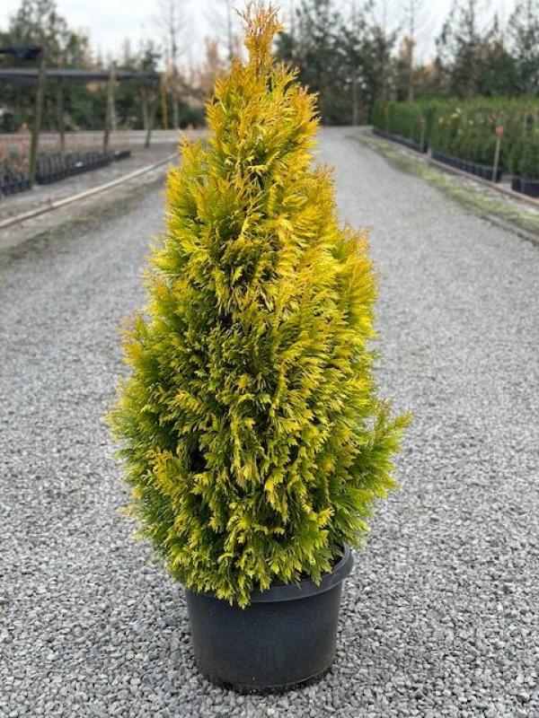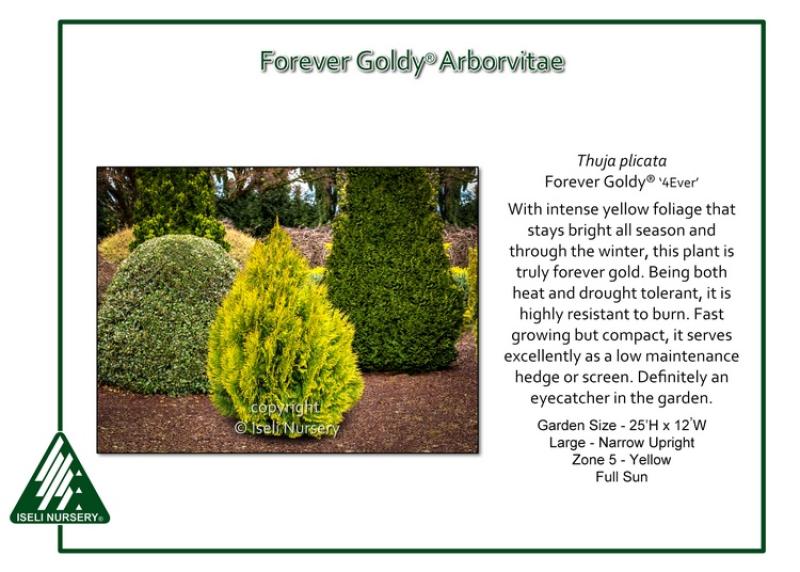 Forever Goldy® is a striking evergreen with intense golden foliage that stays bright all season and even through the winter, creating year-round impact in the landscape. Fast-growing yet compact, this arborvitae is heat and drought tolerant, highly resistant to foliage burn, and exceptionally low-maintenance. Its naturally tidy habit makes it ideal for hedges, screens, or standout single specimens, providing structure and color wherever it is planted.