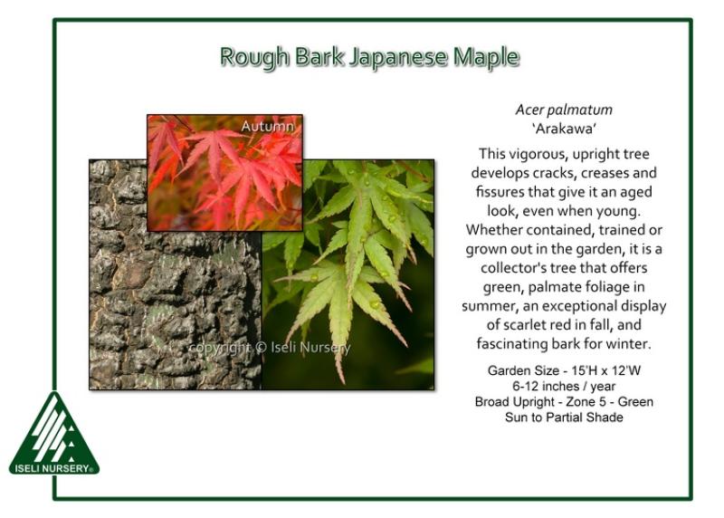 For gardeners who appreciate year-round interest, ‘Arakawa’ is a true standout. Famous for its textured, roughened bark, this vigorous upright Japanese maple develops deep cracks, creases, and fissures early in life—giving it the look of a venerable old tree even when still young.
