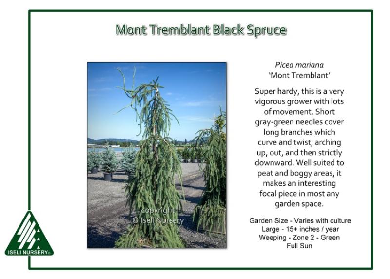 Super-hardy and full of motion, ‘Mont Tremblant’ is a vigorous black spruce with long, arching branches that curve up, out, and then sweep strictly downward. Short, gray-green needles cloak the limbs, giving the tree a textured, windswept look that reads as sculptural from every angle. Naturally weeping and dramatic, it thrives in peat and boggy soils where many other evergreens struggle—an eye-catching focal point in almost any garden space.
