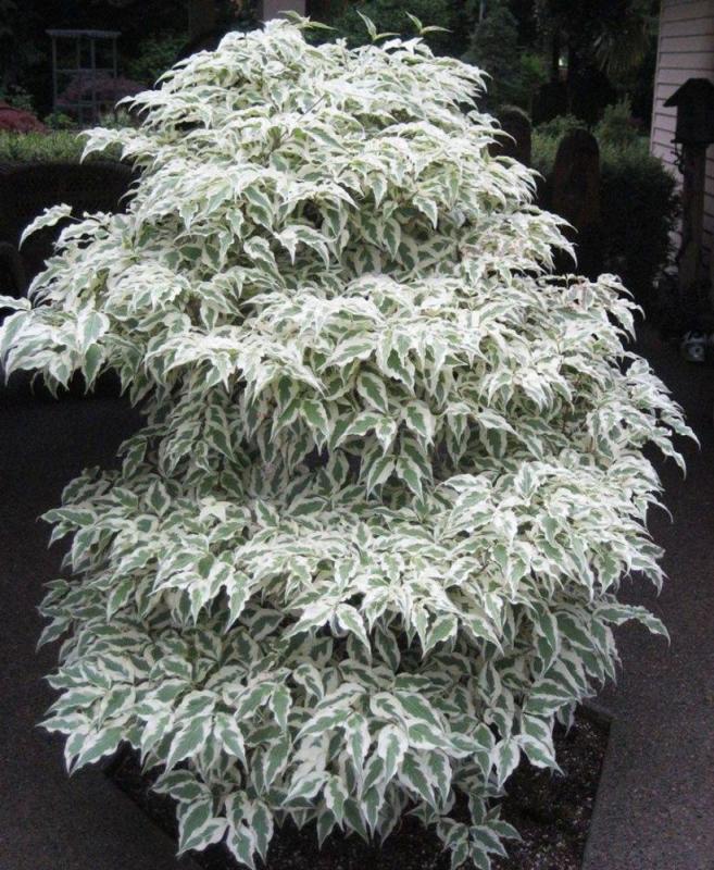 This variegated Kousa Dogwood puts on a great show with its boldly contrasting green and creamy white leaves. White flower bracts add to the show in late spring or early summer. The foliage turns vivid fall tones of red, orange and pink. Best in afternoon shade, in acidic, moist but well drained soil. It grows 18' tall with a spread of 15'. Hardy to Zone 5.