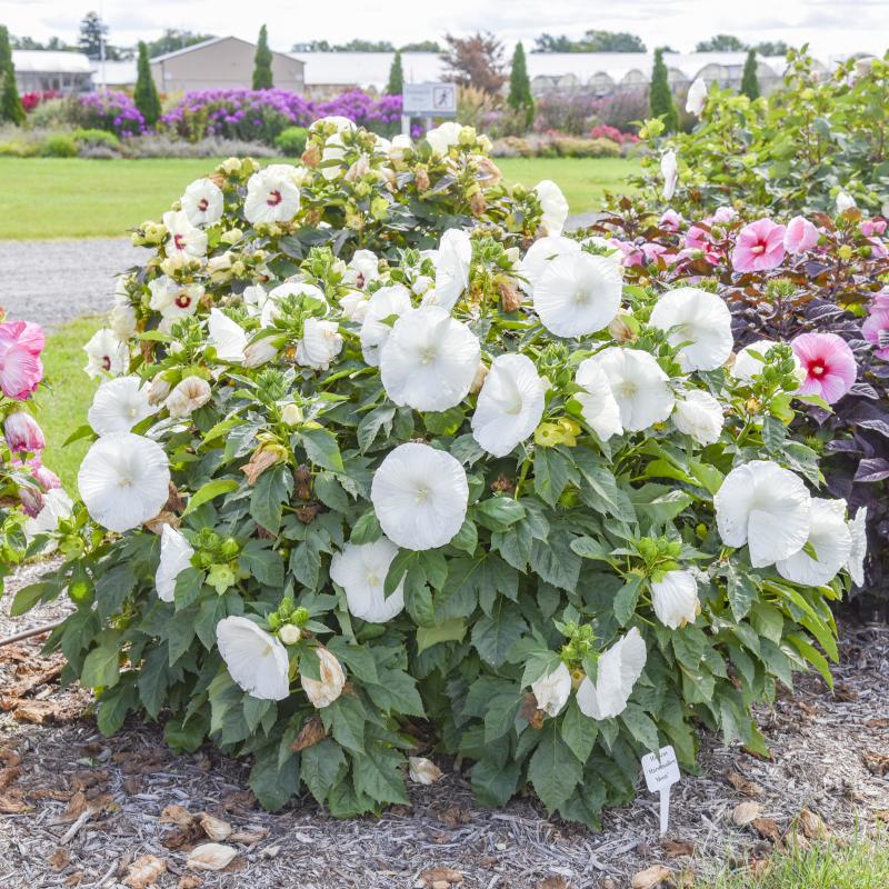 Hibiscus ‘Marshmallow Moon’ is a compact, hardy hibiscus with solid white flowers that bloom along the length of the stem for a high bud count. The dark green foliage forms a dense, rounded habit that showcases the blooms beautifully. It thrives in full sun with consistently moist, well-drained soil. Be advised that Hibiscus are always one of the last perennials to emerge in spring, however, their vigorous growth rate more than makes up for this late start