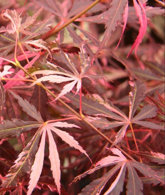 A stunning new introduction, ‘Lileeane’s Jewel’ showcases rare and vibrant variegation of pink and white layered over bright cherry red, heavily divided foliage. The finely cut leaves create an intricate texture, while the bold color pattern gives this cultivar exceptional garden presence from the moment it leafs out in spring.