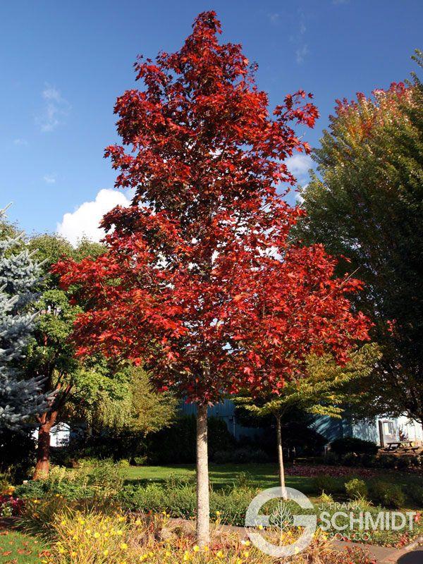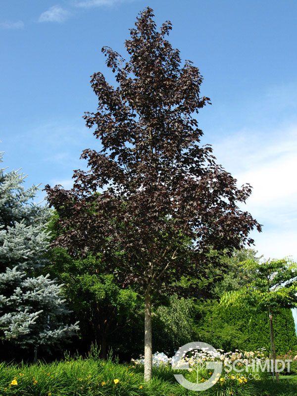 Crimson Sunset® has deep purple foliage all season on a strong hybrid. It's a little smaller and more upright and compact than 'Crimson King'. It grows in an upright, oval to pyramidal shape, 35' tall and 25'wide. Hardy to Zone 4.
