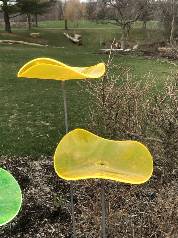 Wave-shaped, yellow suncatcher with swinging rod of fiber-reinforced plastic.