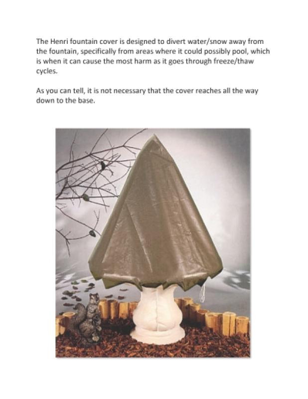 The perfect winter care accessory, Henri Fountain Covers provide maximum protection for cast stone fountains that would otherwise be exposed to harsh winter weather and ice damage. Our covers are specifically designed and shaped for fountains, with bottom-tie nylon drawstrings for a snug and secure fit. Manufactured of durable, reinforced polyethylene, Henri Fountain Covers are waterproof and UV stabilized - and they are reusable year after year. Henri Fountain Covers are simple, but highly effective, and essential as seasonal add-ons.