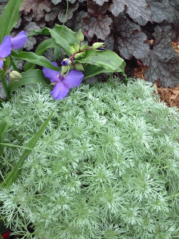 (Wormwood) compact mounded plant about 8-10 inches tall; the foliage is fernlike and silver-gray; sun; Zone 3