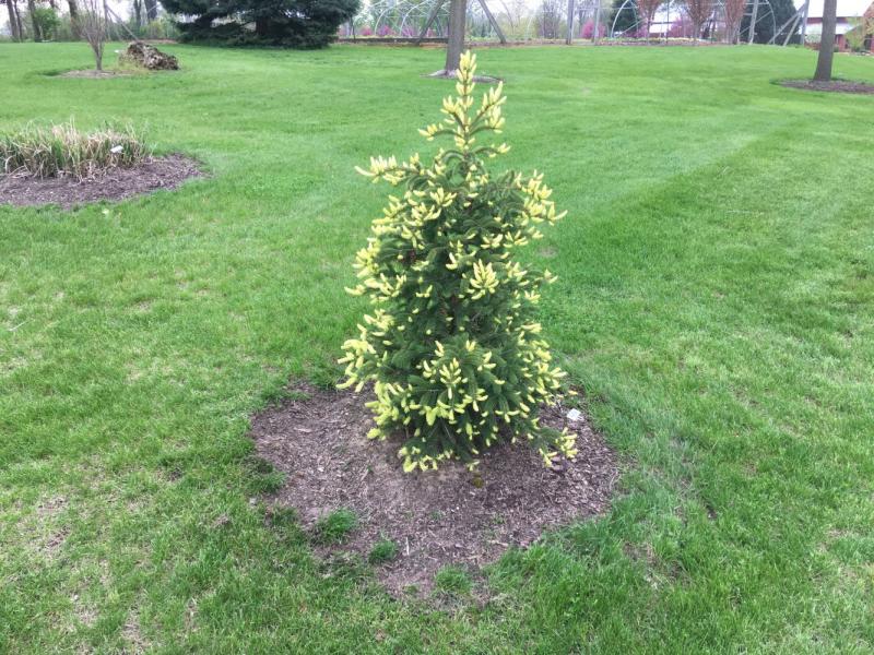 An outstanding selection of White Spruce with small grayish green needles that flush bright yellow new growth in spring, putting on a fantastic show. Small red cones add to the spring display. Best in full sun. Garden size is 20' tall and 15' wide in 10-15 years. Very hardy to Zone 3.