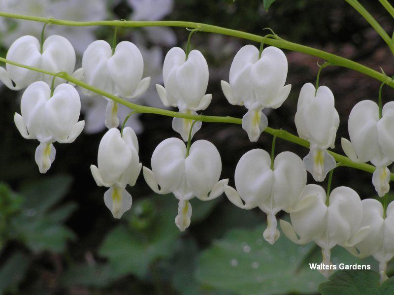 Every bit as charming as the pink form, 'Alba' forms large, bushy clumps of powdery-light green foliage comprised of cut or lobed leaves on fleshy stems. In late spring, chains of puffy, white, heart-shaped flowers dangle beneath the arching, leafless stems. These racemes make delightful additions to fresh bouquets, lasting about 2 weeks in a vase. In cooler climates with adequate moisture, the bloom time may be extended into early summer. Grows best in part to full shade, reaching 30" tall and up to 36" wide. Very hardy to Zone 3.