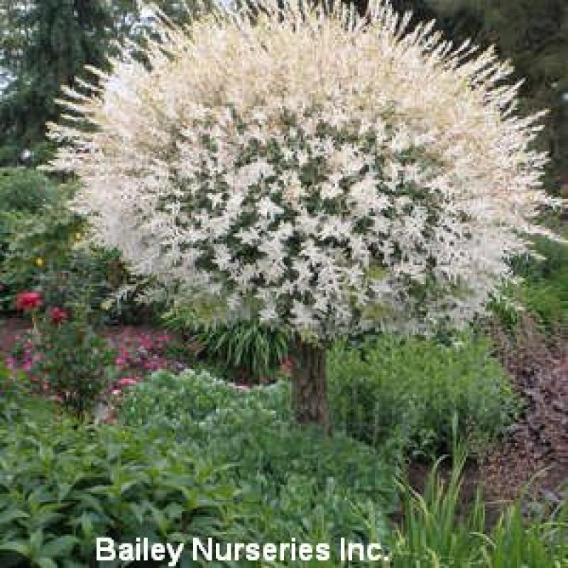 This is the rounded, spreading shrub with pink stems, grafted on a 4' standard. Green, pink, and white variegated foliage, with some leaves all white, put on a nice show. Best in part shade to keep the white from burning. May need staked as a young plant until the trunk thickens and strengthens. Prune back young plants in the spring (and perhaps again in the summer) to keep it from becoming top heavy. As a more mature plant, it can be pruned back to look like a light colored lollipop, or allowed to weep and hang down. Grows 9' tall and 6' wide. Hardy to Zone 4.