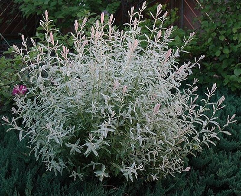 This variegated willow forms a rounded, spreading shrub with pink stems and green, pink, and white variegated foliage, with some leaves all white. Best in part shade to avoid leaf furn. Handles being cut back just about any time, promoting a new flush of stems and foliage. It grows 4-6' tall and wide and is hardy to Zone 4.