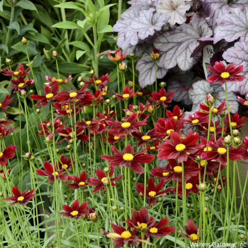 (Tickseed) deep burgundy red blooms atop a compact clump of disease resistant green foliage; blooms have lightly frosted white tips in high summer; 8-12 inches; full sun; Zone 5