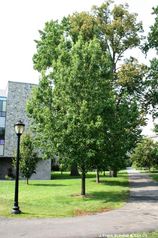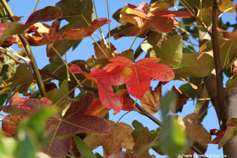 This unique Sweetgum has bright green leaves with rounded lobes, turning to fantastic orange to purple fall colors. Fruitless variety, so no spiny seed balls to step on. Pyramidal form, 45' tall and 25' wide. Hardy to Zone 5.