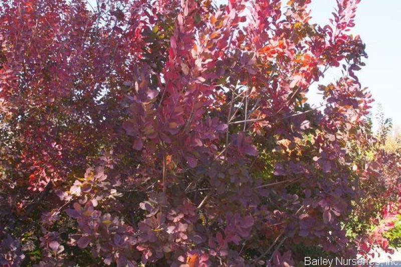 Intense wine-red foliage matures to dusky maroon on a large shrub. Huge, feathery panicles in early summer create the overall effect of a cloud of pink smoke. The bright orange-red fall color is outstanding. Can be grown as a large shrub, or trained into small tree. Size can be controlled by pruning back in early spring. It can even be cut to the ground an allowed to start over. It performs best in full sun, growing 10-15' tall with a spread of 8-12'. Hardy to Zone 4.