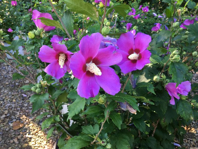 Large, single, deep purple flowers with a deep red eye bloom all summer. Sterile, so it will not reseed. Grow in sun to part shade. Forms an upright vase-shaped shrub, 8-12' tall with a spread of 6-7'. Hibiscus can be pruned in early spring if you wish to manage its height or shape it. Hardy to Zone 5.