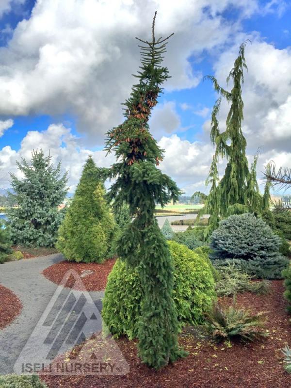 This Red Spruce is a very narrow, upright grower with weeping branches, making a great vertical accent without taking up room. Staking is probably not needed, but you might stake a young plant if it is not shooting straight up the way you want it to. Garden size is 20' tall with spread of 4'. Hardy to Zone 4.