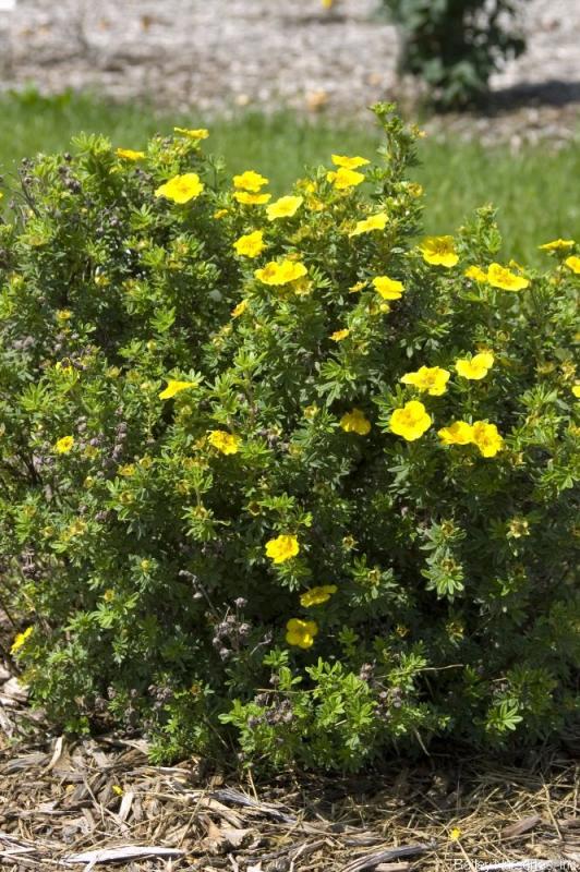 (Potentilla) from the University of Manitoba; yellow flowers with shades of orange and red radiating from the centers; compact, tidy plant, only 2' tall and wide; sun; Zone 2