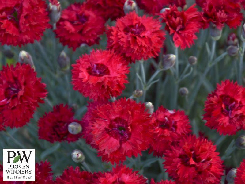 (Pinks) bright cherry red, double flowers have a dark burgundy eye; spiky clump of silvery blue foliage; blooms in both early summer and early fall; 9-11 inches; full to partial sun; Zone 4