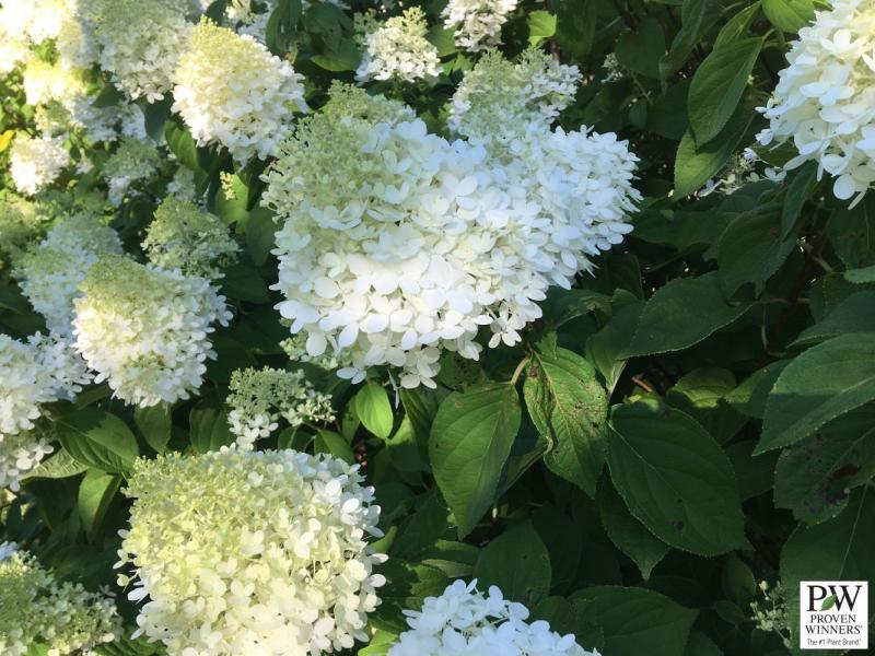 'Limelight' has become a time tested classic and one of the most popular hydrangeas available. Huge, football-shaped flowers open in an elegant celadon green, then go through a bright white stage before aging to an array of pink, red and burgundy which persists through the frost for months of irresistible flowers.  As with most Hydrangeas, morning sun and afternoon shade is best. That being said, if watered well throughout the dry season, grouped plantings of panicle hydrangeas in full sun can be spectacular! Can be pruned back by a third in early spring to control size if desired. Makes good cut or dried flowers. Will grow 6-8' tall and wide. Hardy to Zone 3.